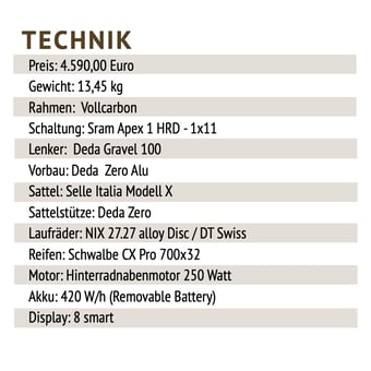 gewählt und passt in sich zum Gesamtkonzept des Rades. Als ein Kritikpunkt wären die geringe Reifenfreiheit am Hinterbau sowie an der Gabel und die kaum spürbare Dämpfung auf ruppigem Schotter zu