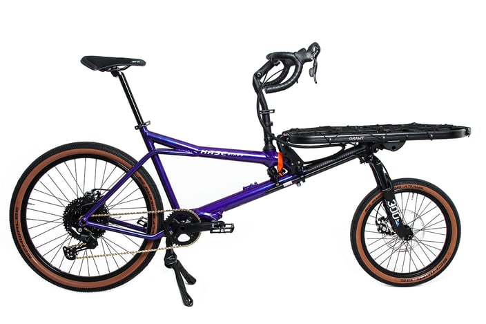 Das Hase Gravit Dust Cargo-Gravelbike verfügt über eine große Ladefläche von 50 x 85 cm über dem Vorderrad, auf der viel Gepäck Platz findet und förmlich nach langen Radreisen über mehrere Tage,